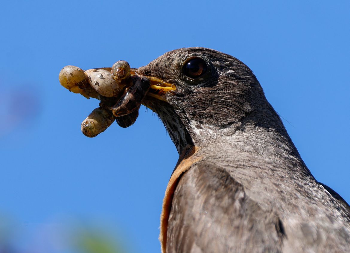 Robin mom with a mouthful of caterpillars just before delivery to her 3 young ones. Saltese Flats, early July