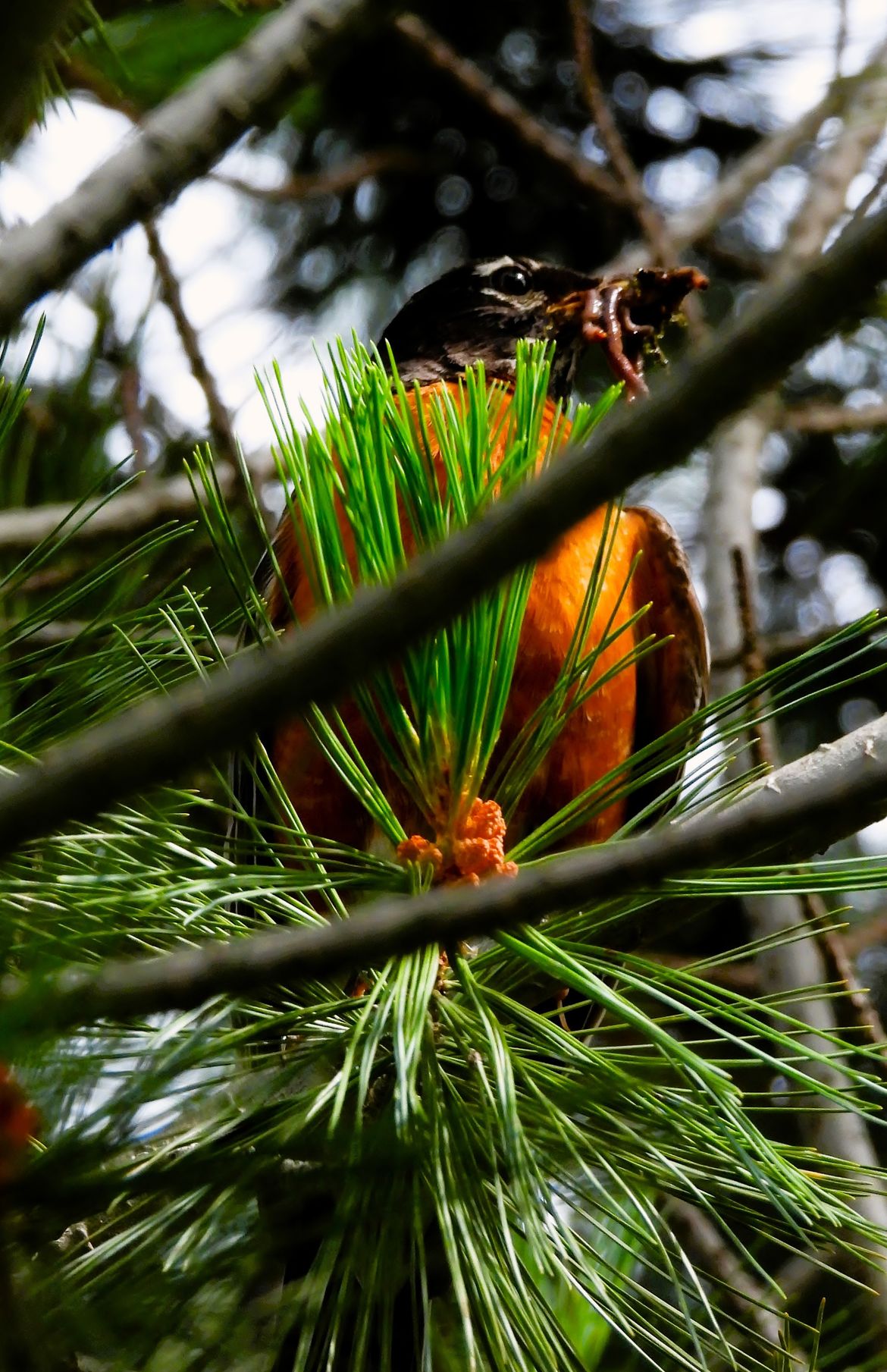 Robin perched in the Vanderwolf pine with a beak full of worms.