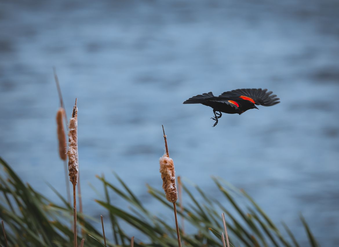 Red winged blackbird takes flight. Saltese Wetland, early July.