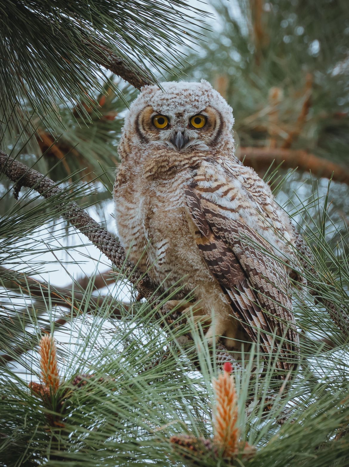Young great horned owlet showing off their plumage and floofiness at Saltese Flats, early July.