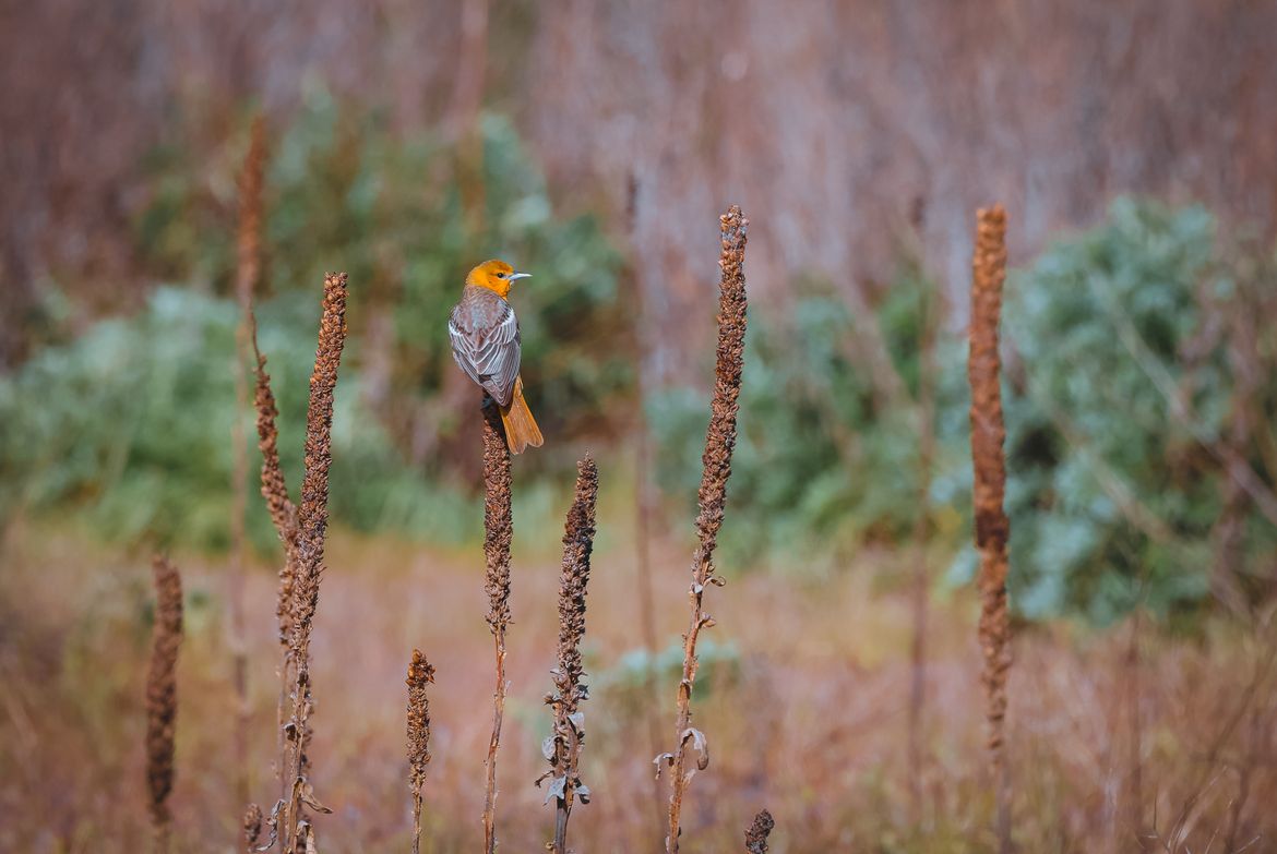 Female Bullock's Oriole rests on a perch. Saltese Wetlands, early July.