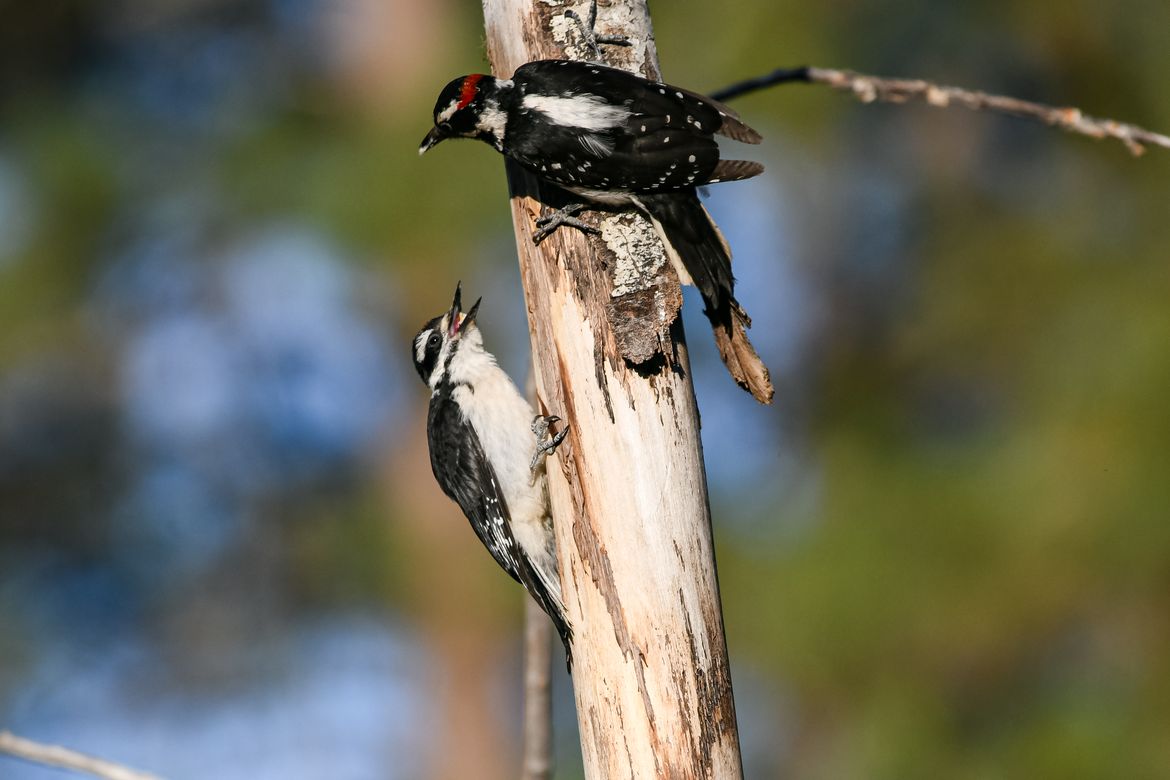 This young Downey Woodpecker has left the nest but is still getting a little help getting fed by dad seen in Marshall the 3rd week of June