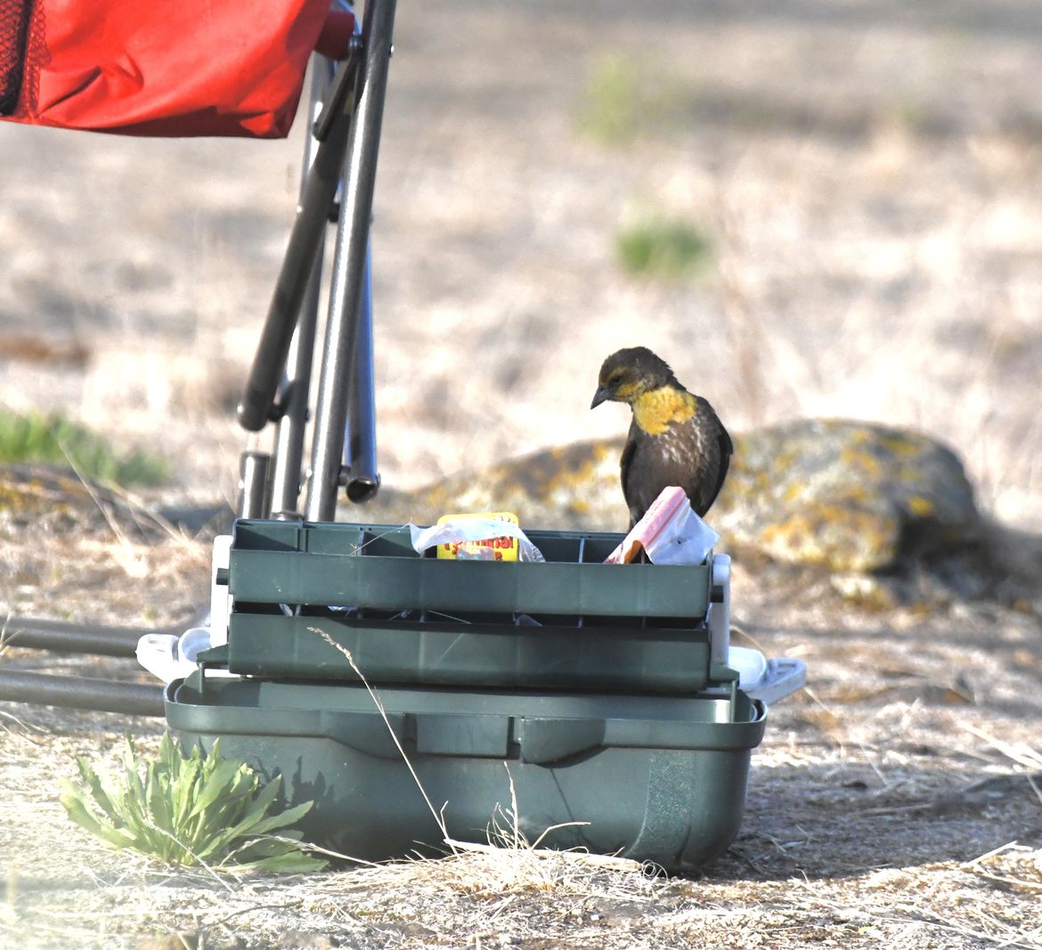 A female yellow headed blackbird inspects a fisherman’s tackle box at West Medical Lake. 6/14/25