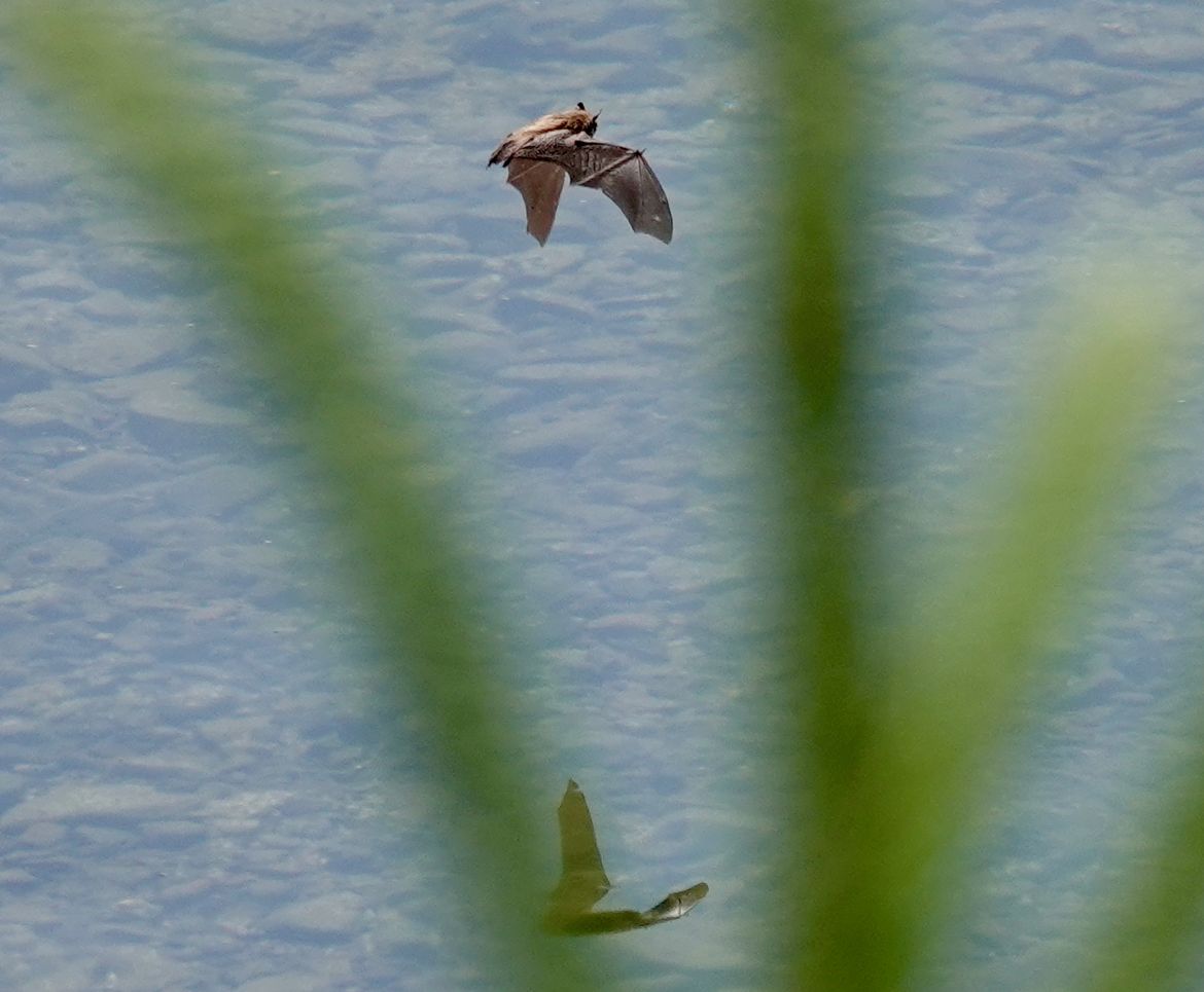 A bat hunting in broad daylight reflected in the still water of Lake Coeur d'Alene June 24, 2025.