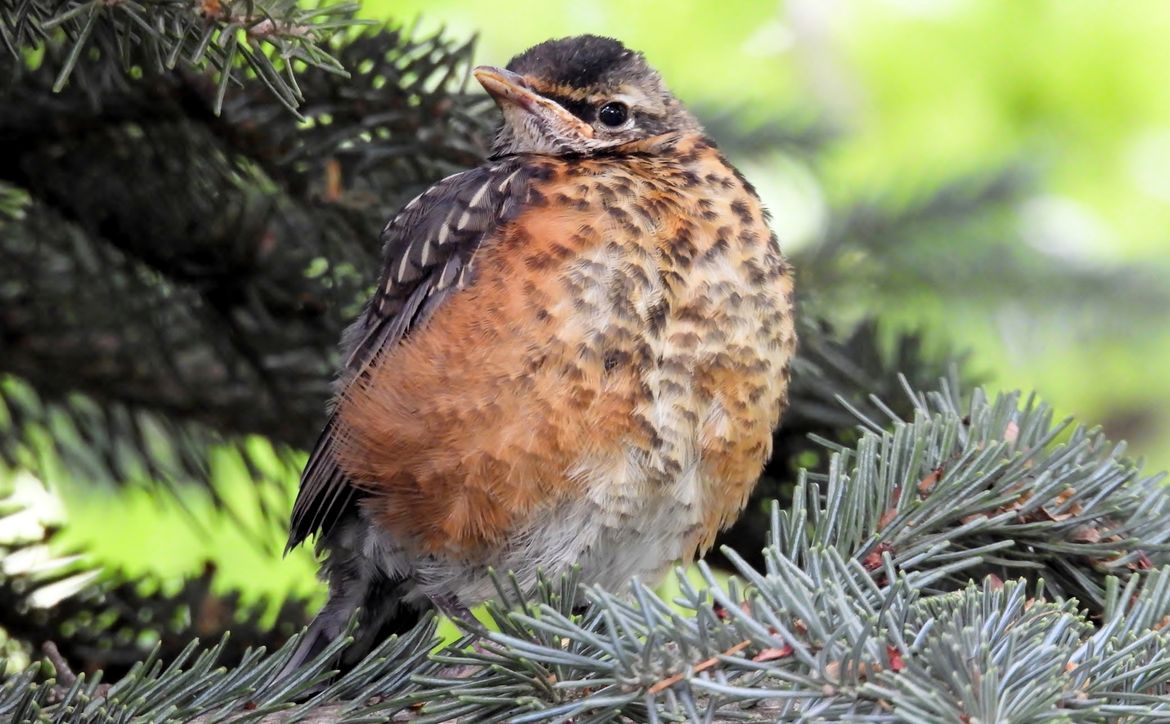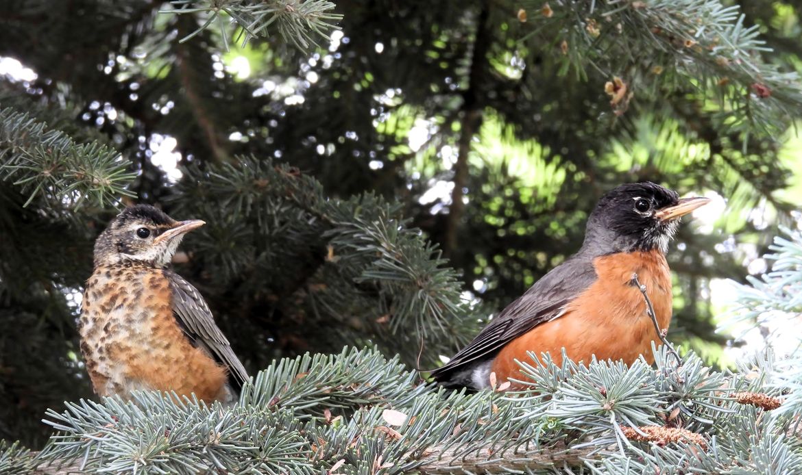 Baby robin and one of its parents perched in evergreen tree in my backyard.