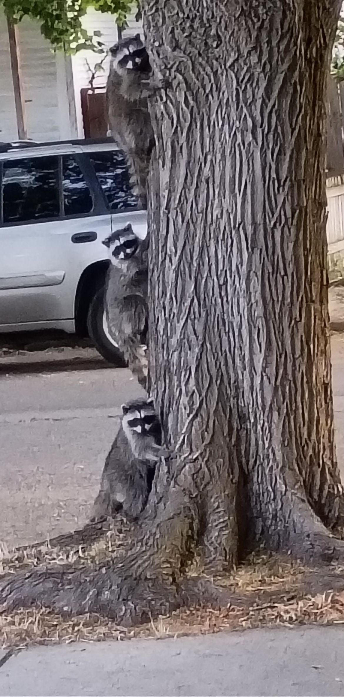 Three young raccoons in West Central neighborhood on June 16, 2025.