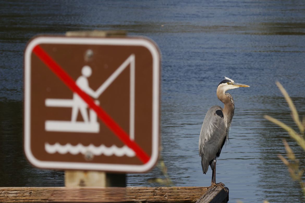 Blue heron appears to be fishing from the dock at Nine Mile Falls boat launch. 6/12/25