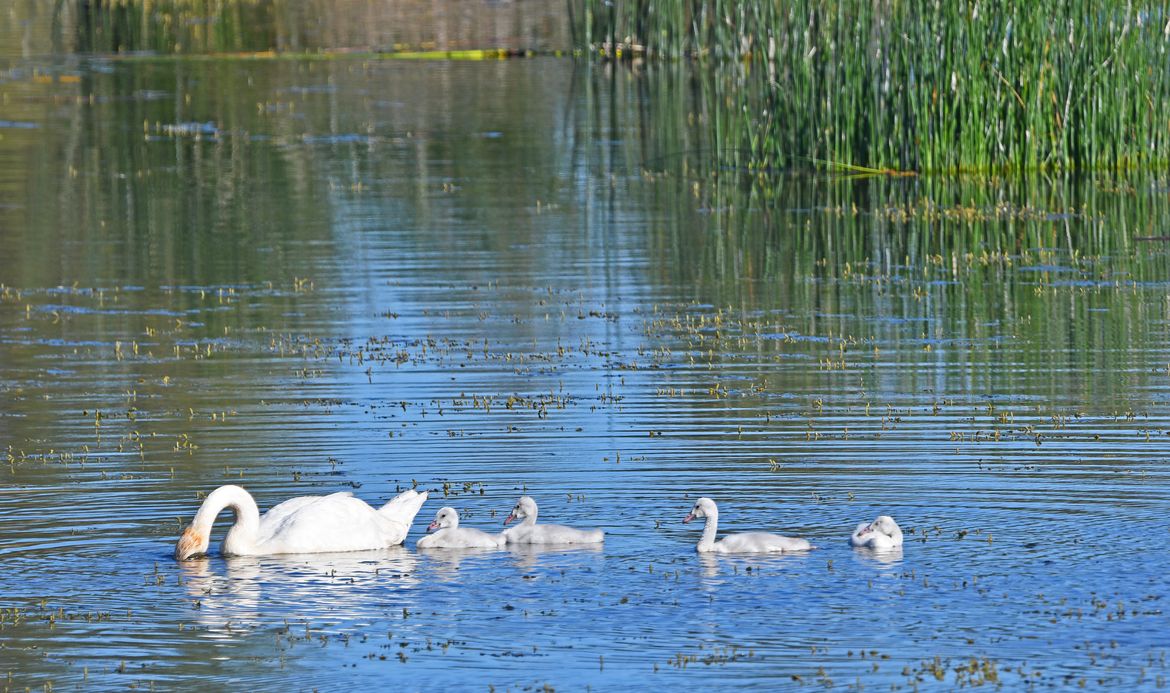 Four trumpeter swan cygnets are thriving at Turnbull Wildlife Refuge. Taken 7/1/2025