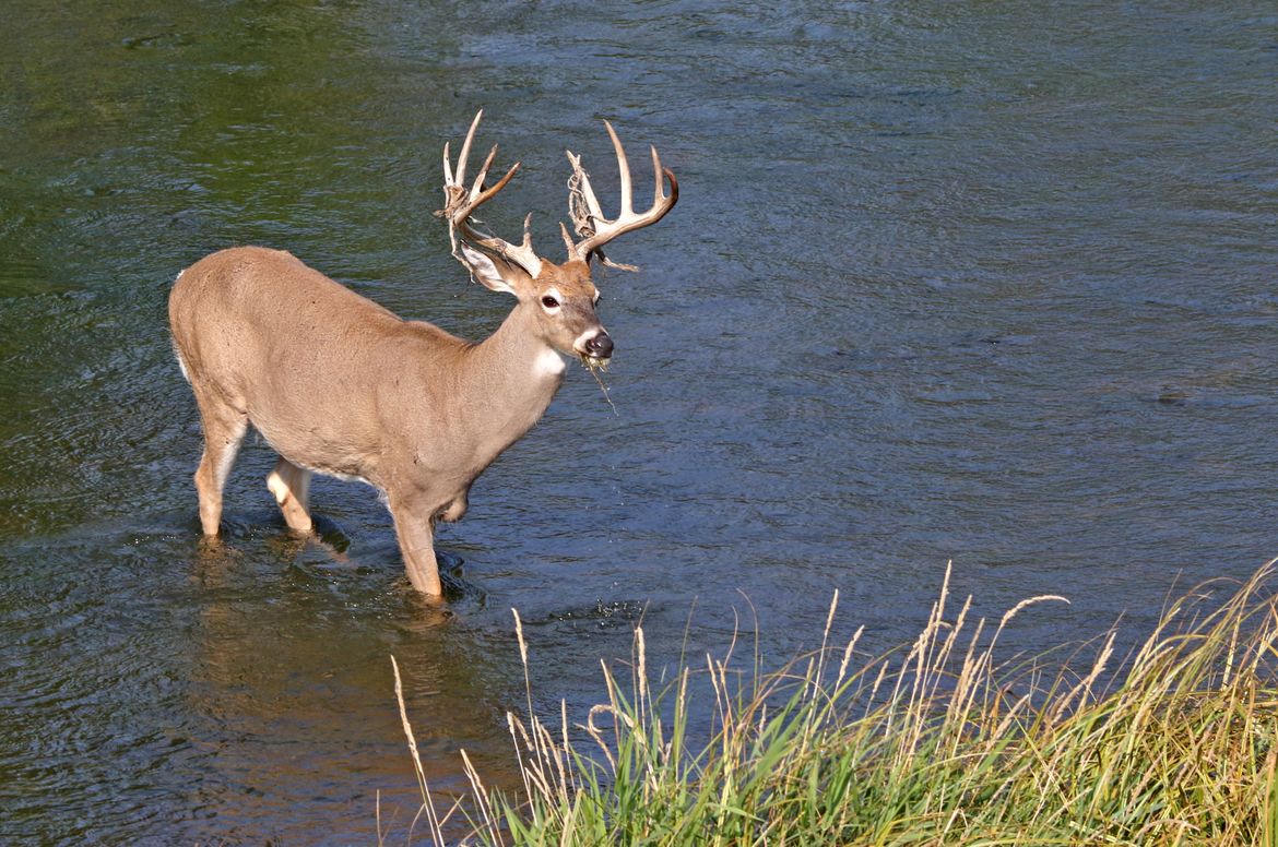 A very pretty Whitetail buck with some dried velvet on it's antlers standing in Mission creek on the Bison Range North of Missoula. Taken 9 10 2025