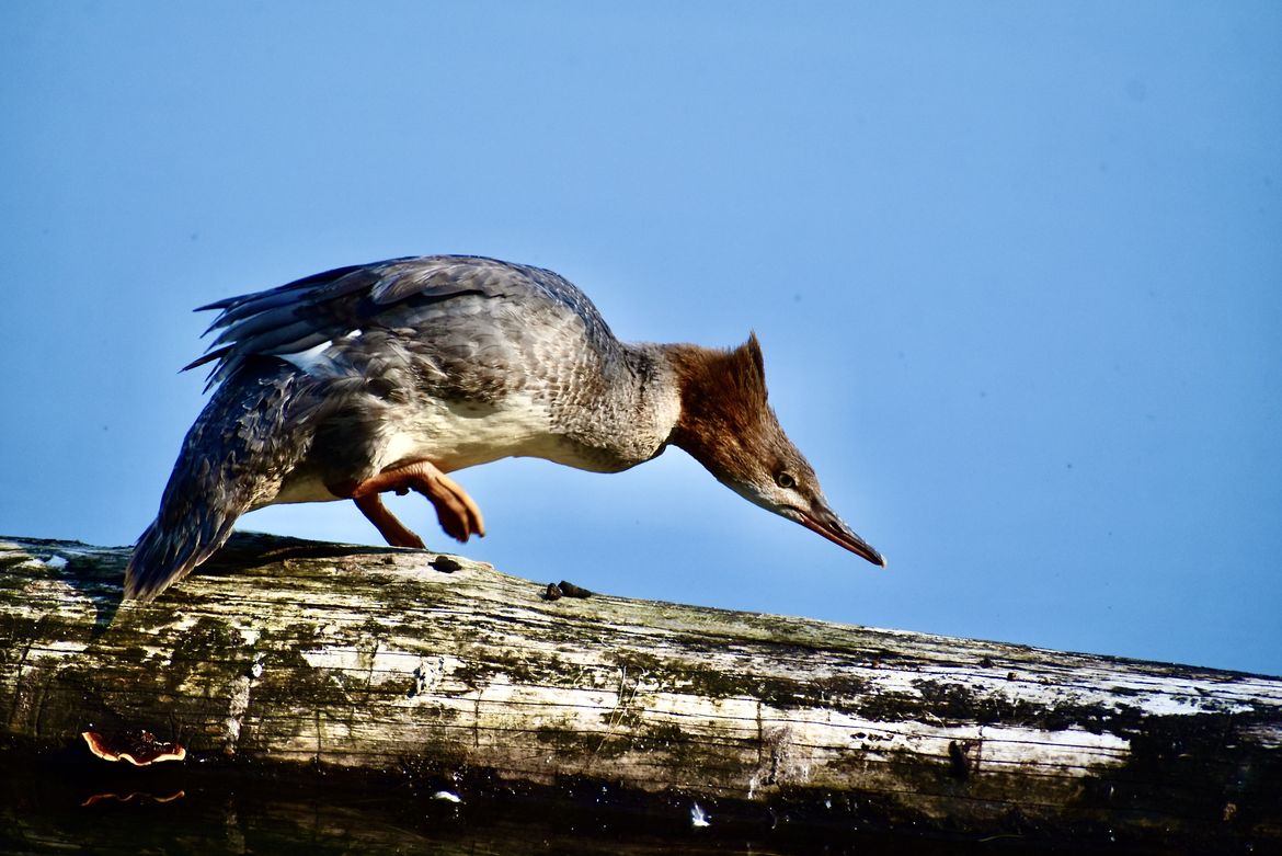 A female Merganser, getting ready to enter the Pend Oreille River water, 9-19-25