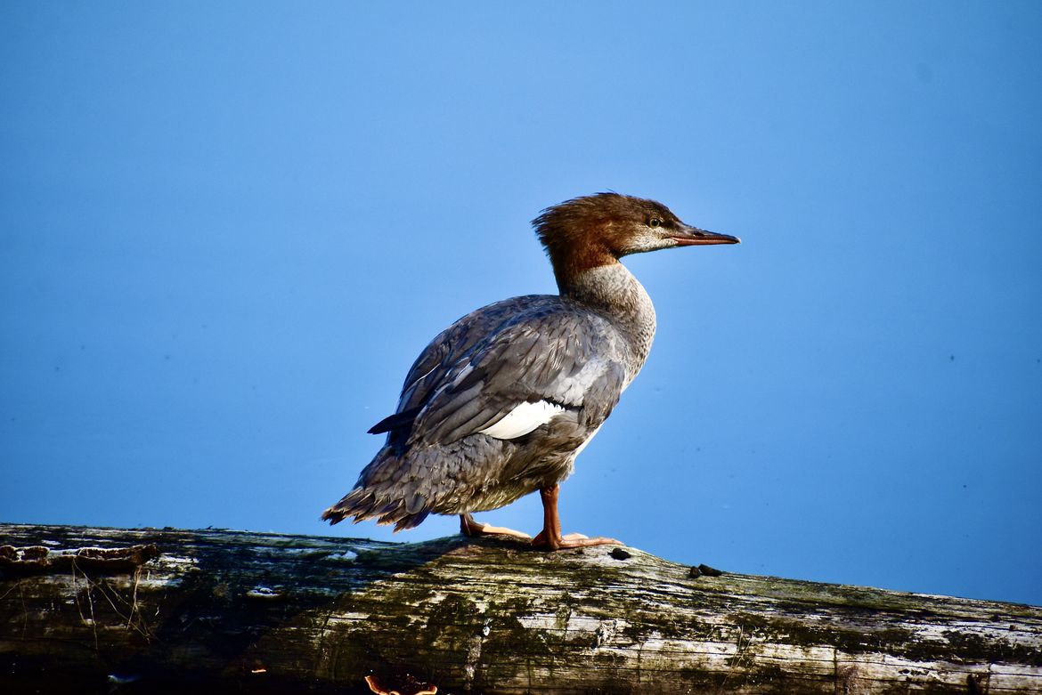 A female Merganser on a log in the Pend Oreille River, 9-19-25
