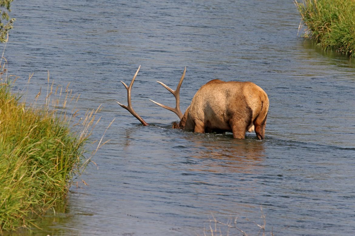 When your hot your hot as this bull elk dunks his head under water on Mission creek on the Bison Range in Montana. Taken 9 10 2025. Found deer and elk both doing this.in an attempt to cool off and get a mouthful of moss