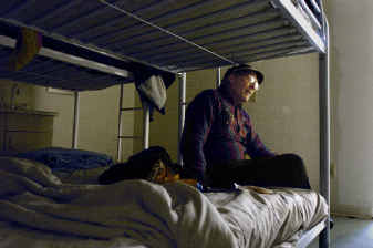 The homeless are allowed into the shelter whether they are drunk or sober, but alcohol, drugs and weapons are not permitted. Marty McKinney, a recovered alcoholic and drug user, pats the guests down and searches their belongings.