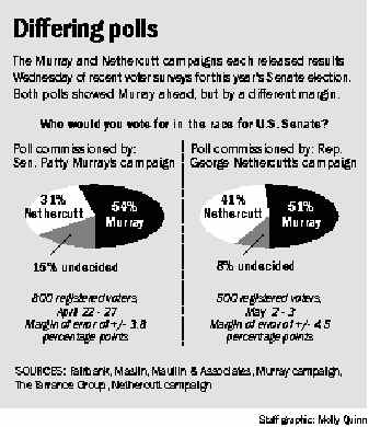 The Murray campaign conducted its poll in late April, in the middle of that ad blitz. If the race were held today, 800 likely voters were asked, would you vote for Murray or Nethercutt?