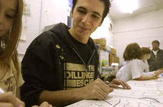 At Art on the Edge, Kimes helps Manning set up for class, then clean up afterward. He helps the kids with their projects, providing guidance where needed. For one assignment the kids were supposed to pick a color and a corresponding emotion. They had a little trouble getting started, so Kimes helped the kids pick their colors.