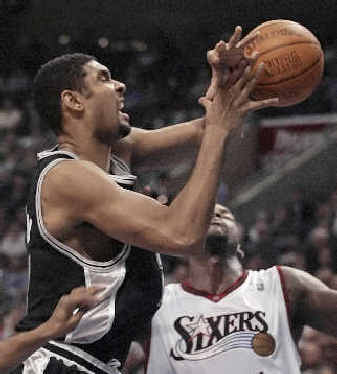 Tim Duncan scored a season-high 34 points and grabbed 13 rebounds to lead the San Antonio Spurs to their fifth straight win, 88-80 over the Philadelphia 76ers on Thursday night at Philadelphia.