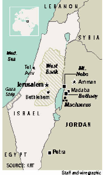 The baptism spot itself is now a dried-up riverbed with ancient steps leading to it. The Jordan River, a meandering body of water, is a few hundred yards away, reached by a shaded gravel footpath.