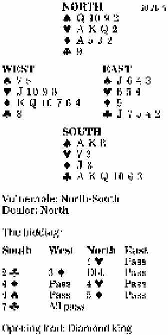 In the other room the Chinese had advanced no further than three no-trump after some intervention in diamonds when both hands took very pessimistic views. The bad club split must have seemed like excellent news to them. However, after the Danish North (playing four-card majors) had opened one heart, South (Bettina Kalkerup) had responded two clubs, and West overcalled three diamonds, there was a dispute as to the meaning of North’s double. North intended it for penalties, Kalkerup read it as takeout, and a few cue-bids later she finished in seven clubs.