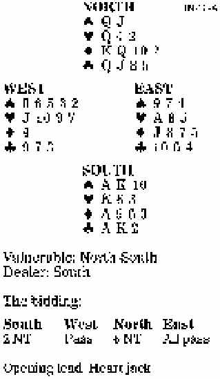 West led the heart jack against six no-trump, and dummy played low, as did East. After winning the heart king, declarer saw that he had 11 tricks, with a 12th available in diamonds. The first thing South had to do was to cash his seven black-suit winners, throwing a heart from table and hand, while each defender also discarded a heart.