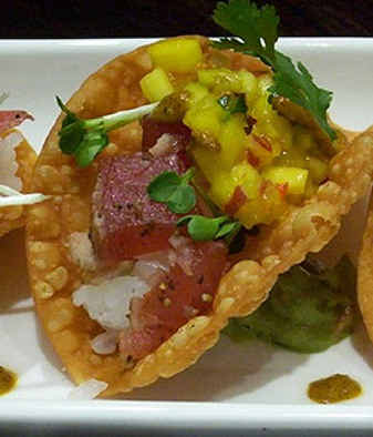 Here now is one of his Pampano dishes adapted for the home “chef.” For Won Ton Tacos With Mango Salsa, you will want top-quality tuna. Sashimi grade is available in good supermarkets, specialty food shops and reliable fish markets. Gyoza wrappers are the Japanese version of won ton or dumpling wrappers.
