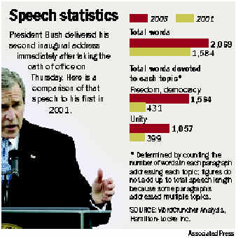 WASHINGTON – Not a word on Iraq. President Bush’s inaugural address contained 2,000 words of passion and promise for his second term, but no direct mention of the war that could sink it.
