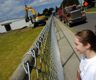 Excavator operator Louis Ray, who has been in the demolition business in Spokane since 1962, drew the attention of two neighborhood preschoolers who stopped their play when they heard the sound of broken glass.