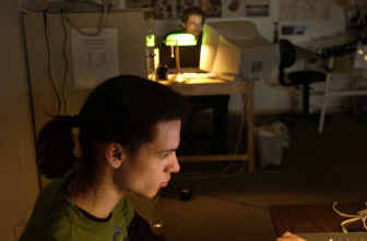 The dimly lit office contains four desks, a battered couch, and a coffee pot. Hagadone’s grandmother owns the building, and cut the business partners a deal on the rent.