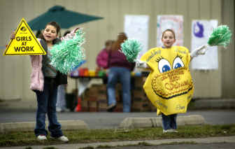 While three of the girls sat at the booth with a pad of paper and a metal box full of change, the other two sported Girl Scout cookie costumes and waved to passing cars.