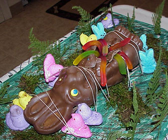 The result is pretty amazing and very detailed. Two Peeps are standing on top of each other to better reach the top of the bunny. One Peep is making a break for it with the bunny’s eye and two other Peeps are sharing big pieces of chocolate. Um, bunny. Big pieces of bunny.