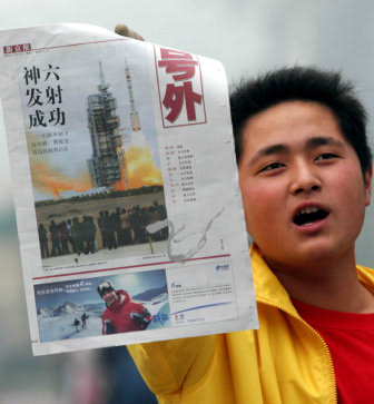 Shenzhou 6, riding atop a Long March 2F rocket, lifted off from Jiuquan Satellite Launch Center in Inner Mongolia on Wednesday, carrying Fei Junlong, 40, and Nie Haisheng, 41, both colonels in the People’s Liberation Army. The mission, capable of staying up for a week, is expected to end with the descent module parachuting into the Gobi Desert.