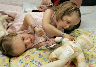 To help them understand what is about to happen to them, Kendra and Maliyah have been given a set of conjoined stuffed dolls to play with. Like the girls, the dolls get Band-Aids and shots. On July 20, Kendra performed separation surgery on the dolls, as Maliyah looked on.