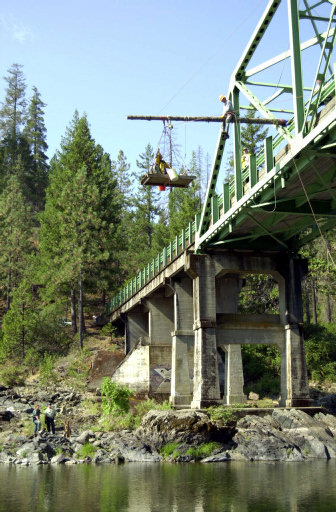 Forest Service personnel slowly lowered Sutherlin to the river. He waded to shore, where he was handcuffed.