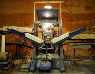 The dusty warehouse is full of saws, saw blades, sanders, old box-nailing machines and stacks of wood.