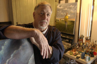 His newest painting titled “Starting Over” shows a man heading West, leaving behind a burning house and the big city. “It’s a metaphor for where I am now,” he said.