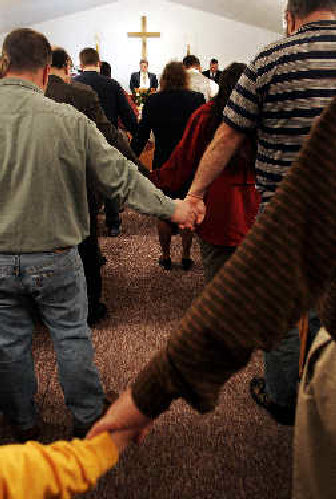 Churchgoers sang hymns, including “The Sweet Bye and Bye” and “Farther Along,” which speak of accepting God’s unfathomable plan.