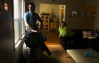 The room seems designed to house the Vespa, Jonny’s prized possession. The geometric throw rug stops short of the wall, creating a little hardwood parking space just inside the front door. A metal ladder-type magazine rack climbs up from the front wheel. The magazine covers, themselves little works of art, further frame the Vespa.