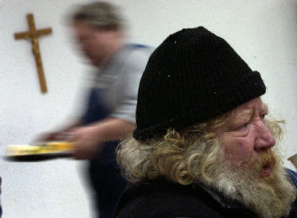 As folks took their plates and settled at the long cafeteria tables, Sizemore scanned the crowd. In one hand, he held a sheaf of papers, a stack of surveys for the count of homeless people conducted twice a year by the local chapter of St. Vincent de Paul.