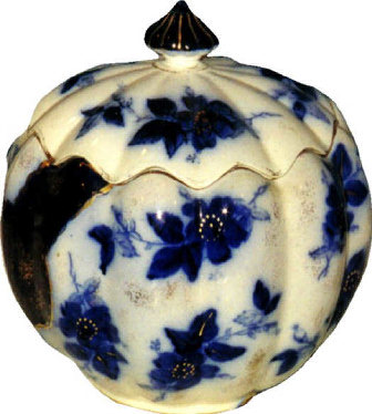 A little Holmesian sleuthing (and rearranging of letters) proves your circa 1890s flow blue covered bowl was made in the Stoke-on-Trent pottery of Sampson Hancock & Sons. Value is a bit more difficult to determine, but let’s call it between $75 and $125.