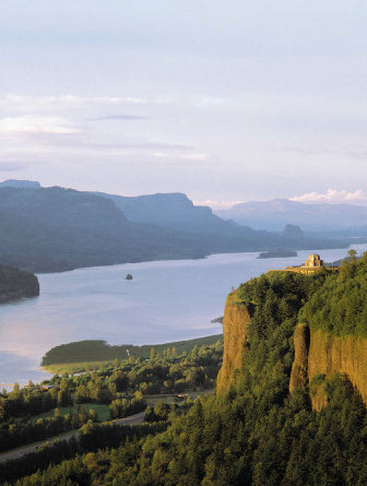 Standing on its balcony and looking east, you can watch swallows soaring above the waters of the Columbia River. Cars and RVs look as tiny as ants on Interstate 84 below. And the green forests and ridges on both the Oregon and Washington sides of the river are visible.