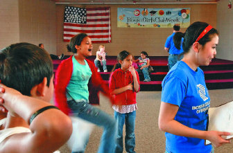 The students and staff gather twice a day for a big assembly. On a recent afternoon, activities director Ryan Rodriguez outlined the various options for kids to choose from. At the end of the assembly, Rodriguez shouted, “What’s life about?” The kids thunderously replied, “Choices!”