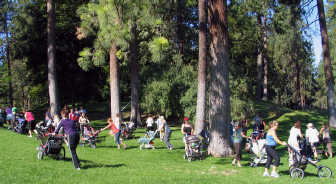 After they had slathered their children with sunscreen, they formed a circle and set their stroller’s brakes to start their morning workout.