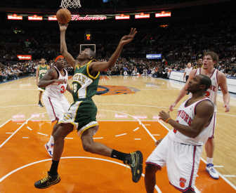 Former Knicks forward Kurt Thomas scored five clutch points in the final 2:31 as Seattle handed New York its fourth straight loss. Luke Ridnour and Wally Szczerbiak each scored 12 points to help the SuperSonics snap a five-game road skid.