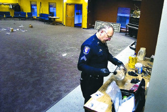 Eight to 10 doors and some wooden podiums were kicked in, walls and floors were spray-painted, and the contents of several rooms – including copious quantities of messy food – were turned into great piles of debris. A copier valued at $4,000 was smashed and spray-painted, Strickland said.