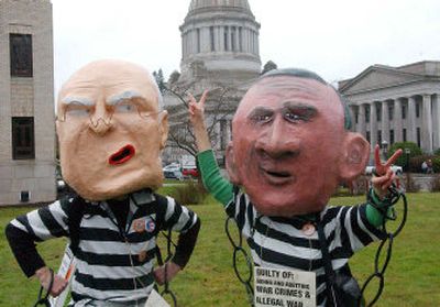 The two were in Olympia to support Senate Joint Memorial 8016, which calls on Congress to investigate whether there is enough evidence to charge the president and vice president with misrepresenting the severity of the threat posed by Iraq, giving Congress “distorted” intelligence, conducting surveillance on “perhaps millions of American civilians without seeking warrants” and “strip(ping) American citizens of their constitutional rights” based on their being designated an “enemy combatant.”