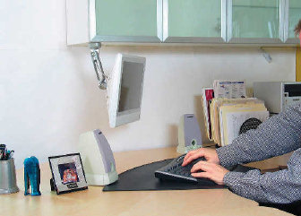 “Keep the surface area clear with mounting hardware to hang a computer monitor from under the cabinet or attach to the wall. Look for a mount that rotates a full 180 degrees for full viewing from any angle. Use a pullout keyboard and mouse tray that can be placed under the counter.
