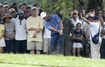 Woods’ frustration showed again at the 18th, when he had his only bogey of the day. He made two angry swipes with his club after driving his tee shot into the left rough.