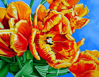 One of the florals, “Flaming Tulips 2,” evolved out of another painting.