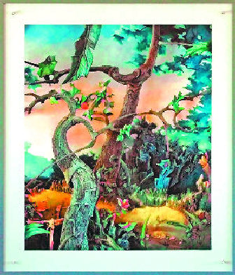 Grimes’ “Forest,” while not quite a backdrop for a Stephen King novel, conveys tension and mystery with its dominant, dragon-like tree; single, tempting red apple; and unnatural landscape.
