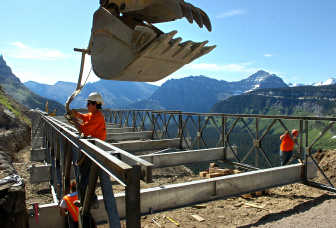 GREAT FALLS – Workers slowly slid a massive metal bridge over a gaping hole in Glacier National Park’s Going-to-the-Sun Road on Wednesday.