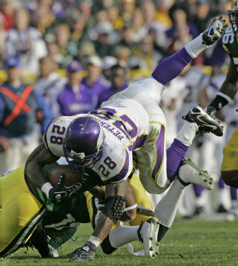 After an 11-yard catch on a screen, he was hit by Packers cornerback Al Harris and went tumbling, his feet high in the air.